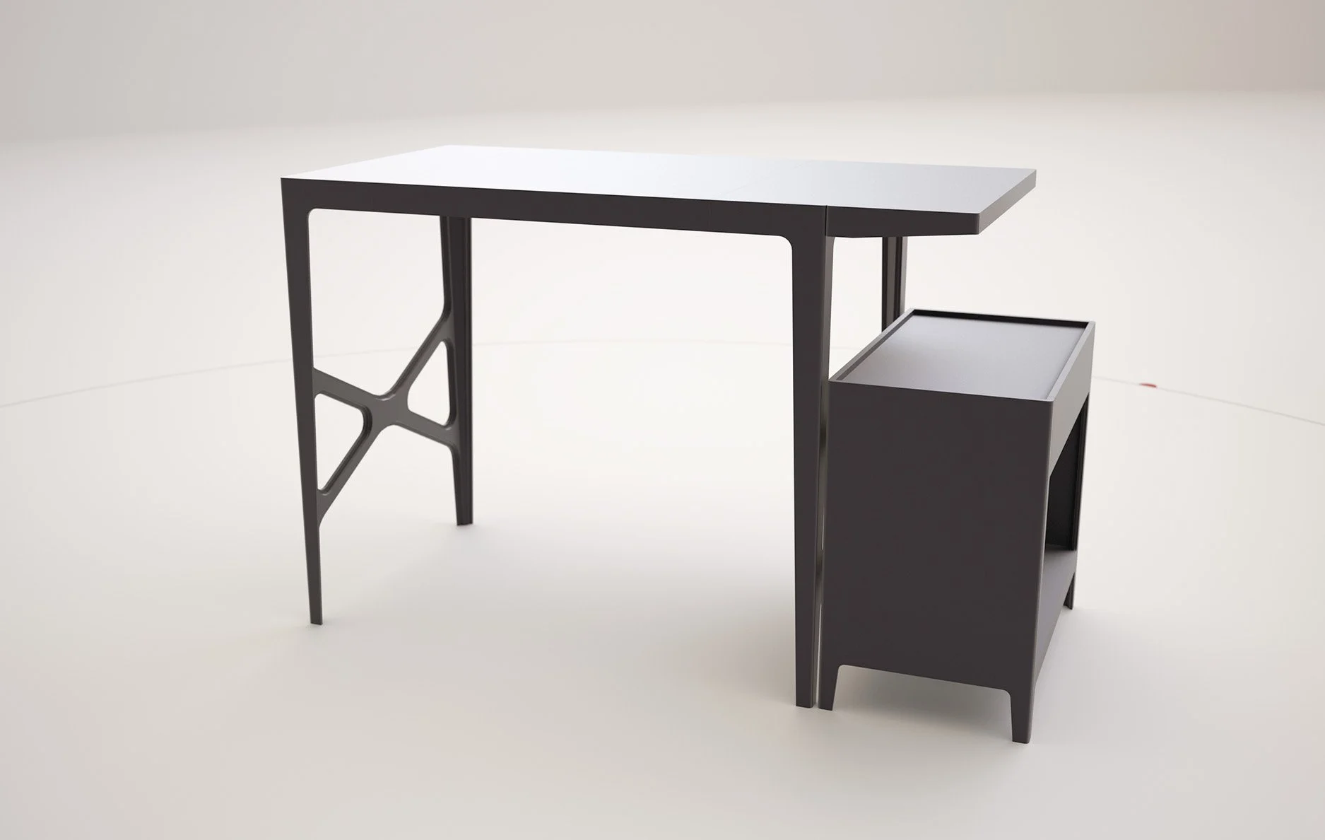 The TD005 is a “mini” writing desk from the StealthSeries which feature flush surfaces, thin edge detail, and rounded corners. All coming together to form a desk appropriate for a low impact home office. The TD005 features unibody torsion box chambers and half-lap spar construction. For a more eccentric, asymmetrical and larger desktop there is the TD005ex with a deck extension. Additionally there is an available accessory chassis with a drawer and enclosed shelf which can be positioned below the deck extension to form a symbiotic pairing. The desk itself consist of three modules, a center deck, and two combination deck/leg modules that simply bolt together. Made with Baltic birch plywood and available with a natural oil/wax finish or painted with a satin poly top coat finish. For a black finish, the table is stained and topped with a natural oil/wax finish. Dimensions: TD005: W34” x D21” x H29”, TD005ex: W42” x D21” x H29”; Chassis unit TD005-CHS: W21” x D12” x H15.5”